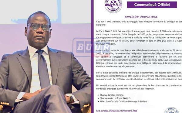 Le Parti Awalé a officiellement lancé, ce dimanche 28 décembre 2025, une campagne nationale de mobilisation baptisée « Cap sur 1 000 Jambaar ». Cette initiative vise la vente de 1 000 cartes de...